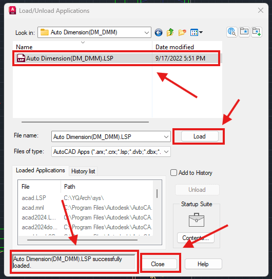 بعد از باز شدن پنجره Appload کافیست در مسیر ذخیره سازی لیسپ دانلود شده قرار بگیرید و سپس آن را انتخاب کنید و سپس گزینه Load را بزنید و بعد از نمایش پیام Auto Dimension(DM_DMM).LSP successfully loaded میتوانید مطمئن شوید که لیسپ به درستی آپلود شده.